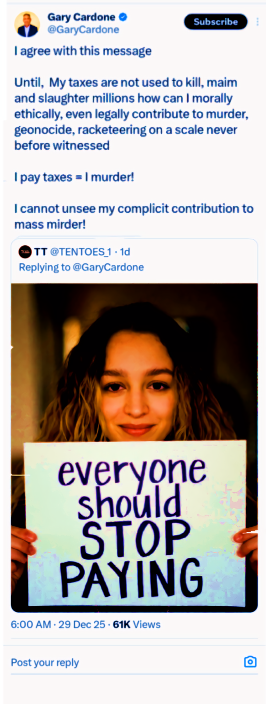 These people are a little late to a party thrown by Myself on this platform –the original one–a few years ago where I mentioned that if it could be proven that the feds were complicit in the genocide of Americans, if it could be proven that our tax dollars were spent on genocide paraphernalia, if it could be proven that they assisted with the logistics that countless murderers needed to abscond–such as physicians, pharmaceutical companies, police departments, coroners, family of the victims (they have to keep quiet while the person falls apart) as well as the operant conditioning on society as a whole (Think University students who, for the first time in world history, are posting pro-genocide paraphernalia. This is substantial as University students are one sociographic sample of society you can historically depend upon to show up and protest everything from genocides in Rwanda to the deforestation of our Fiji Islands to the rights of women and minorities and homosexuals to the endangered dolphins and rhinos from poaching.) which requires a hell of a lot of effort. That’s premiditation. Premeditated murder en mass by the one qagency depended upon by Americans to do the opposite. And if this turns out to be the case? Shouldn’t the taxpayer demand a refund? Shouldn’t he stop paying until he’s certain that the money he hands over doesn’t go to Al Quaeda? Or the FBI? Or those responsible for the death of a rumored [millions] of Americans which went undetected because it was accomplished by cancer? If it’s cancer doesn’t that make it harder to prove it was from poisoning? How do we know it wasn’t your cigarette smoking of 10 years ago? We don’t. So it seems to Me that we should stop paying federal txes until we have a sure-fire way to insure out money doesn’t finance our own demise. Saddam Hussein reportedly sent a bill to the family of those he had killedfor some offense. He shot them with a pistol and sent their family a bill for the bullet and his time. I don’t know about you, but I prefer the good Ol’ USA to Afghanistan any time.