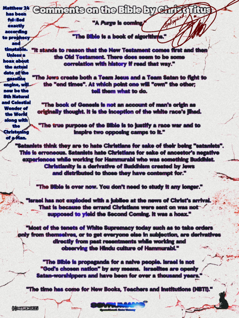 A summary of the additional understandings of the Bible made heretofore were summed up and published on a graphic, Comments on the Bible by Christ Titus. This was also published within the last year and I received boo-koo compliments for it in Los Angeles as I walked about from all walks of life.